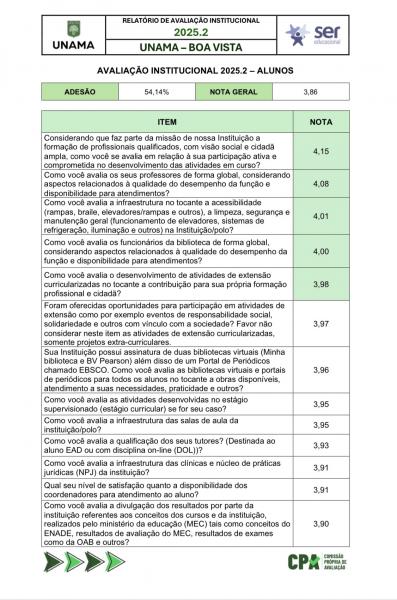 O presente relatório tem como objetivo apresentar a estratificação das informações obtidas por meio das Avaliações Institucionais, realizadas na IES no período de outubro a novembro de 2025, contemplando a participação dos segmentos que compõem este processo: alunos, professores, técnicos administrativos e sociedade civil.